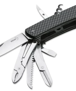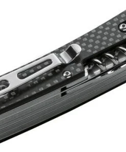 With the Boker Camp Knife, one of the forefathers of all modern multi-purpose pocket knives, our history began in the year 1869. After almost 150 years of successful market presence, the time came to convert this proven concept into a modern knife. The modernized construction, which is based on solid steel liners, is embedded in two contoured handle scales, made out of lightweight carbon fiber. The Swedish Sandvik 12C27 steel, with a Rockwell hardness of 58-60 HRC, provides outstanding edge retention of the hollow ground blade. The high quality manufacturing, with a smooth blade action and optimized operability, are proof of the premium quality of our Boker Plus Tech Tools. Tools: glass-breaker, screwdriver with bottle opener and wire stripper, small serrated blade with screwdriver tip, corkscrew, foldable lanyard hole, scissors, punch/awl, pliers, wood saw, pocket clip.