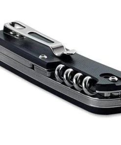 With black G10 handle scales. The hollow ground stainless steel blade made of 12C27 Sandvik is accompanied by these tools (4Cr13): Glass breaker, flat screwdriver with cap lifter and wire stripper, small serrated blade with flat screwdriver, cork screw, lanyard hole, clip.