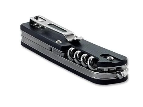 Glass breaker, flat screwdriver with cap lifter and wire stripper, small serrated blade with flat screwdriver, cork screw, lanyard hole, clip.