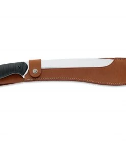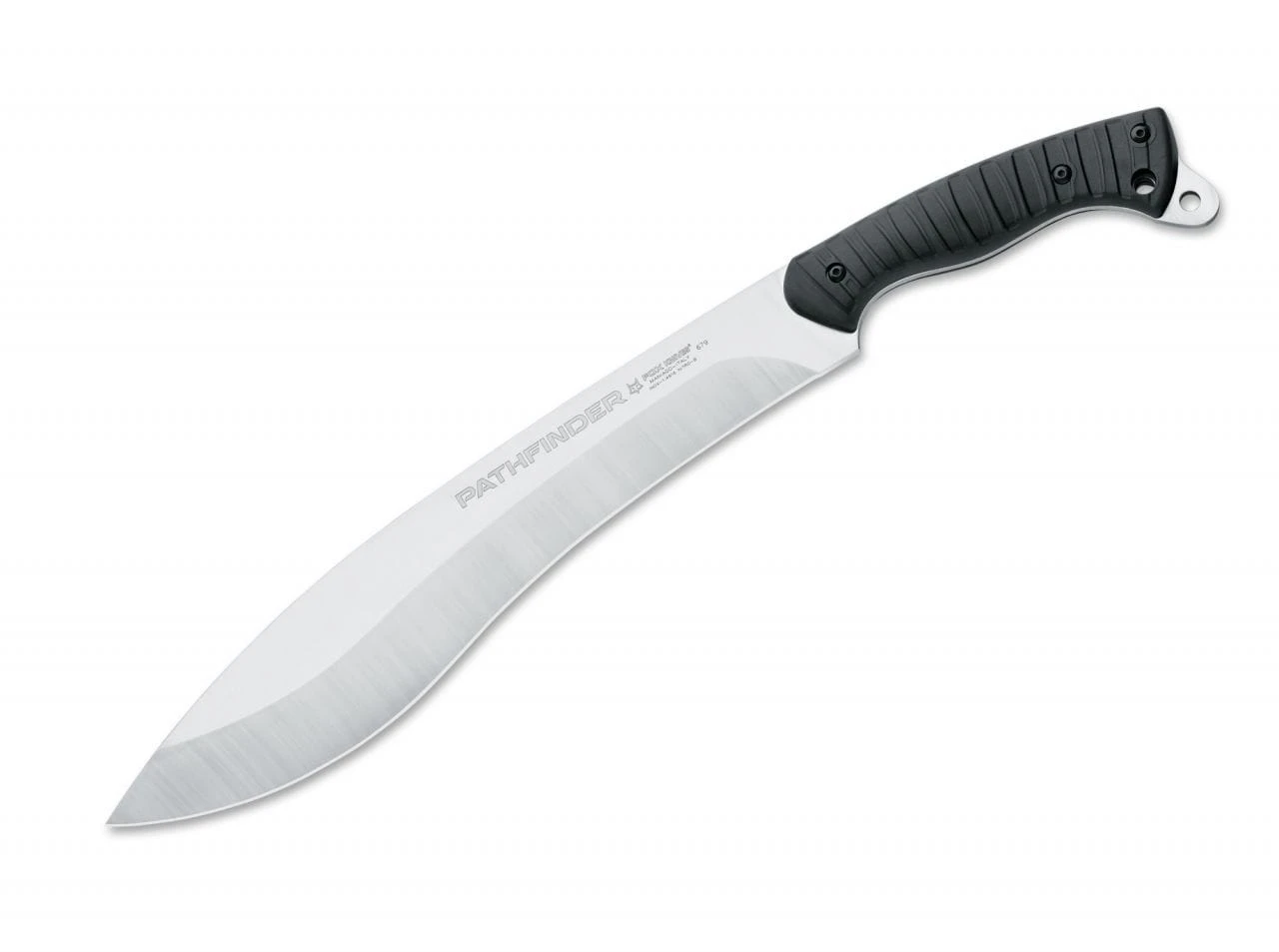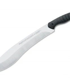 Exquisitely equipped with stainless Nitro B from Buderus as the blade steel, the Pathfinder is more than able to run with the big dogs. Its edge-holding properties far exceed classic “machete steels”, while the 5 mm blade thickness enhances the strength and effectiveness. The slip-resistant texture on the rubber-coated FRN handle promises outstanding grip. Shipped with leather sheath.