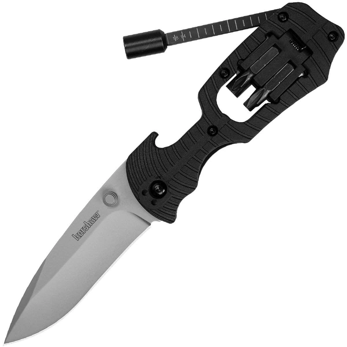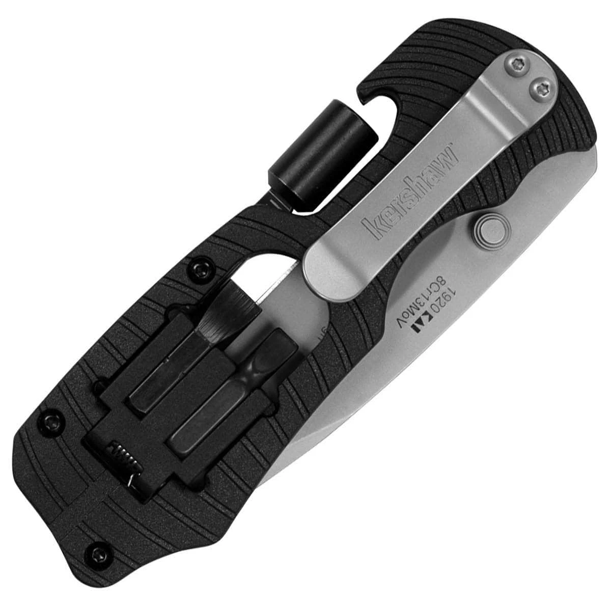 This multitool aspect of the knife is integrated into the textured glass-filled nylon handle scales and includes 2 flathead bits, 2 crosshead bits, and a bit drive shift with a ruler.