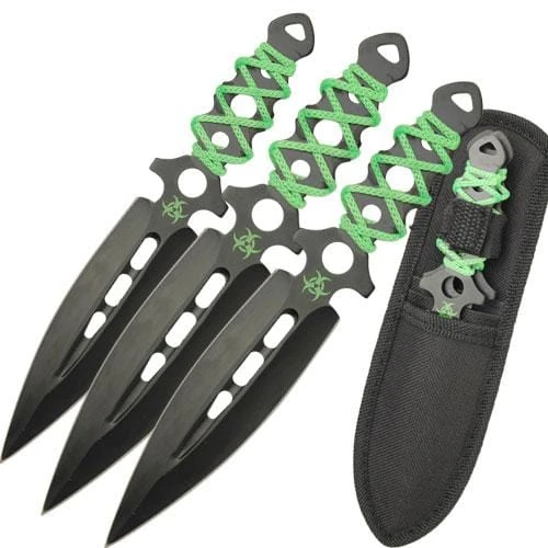 Featuring an aerodynamic spear point design and perfectly balanced for extreme accuracy when penetrating your target, this 3 piece throwing knife set is a must have. The 440 stainless steel double edged blades have an anodized black finish to reduce glare with a biohazard symbol is in the center to complete the dangerous but sleek style. Each handle is wrapped with green nylon cord for a firm grip. A very durable nylon sheath with belt loop is included to keep this knife snug, secure and at your side at all times.