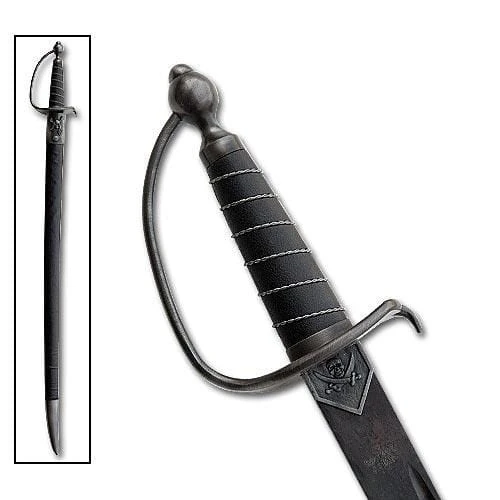 38″ overall 29 1/4″ blade If you have not noticed it lately…Pirates are hot!! So, don’t be left out in the cold! This new cutlass sword has everything a brave pirate needs to fight those angry mutants.blade constructed from steel with an authentic aged finish. The classic black handle is accented with cast zinc guard and pommel. The wooden scabbard features a cast metal throat with pirate emblem.