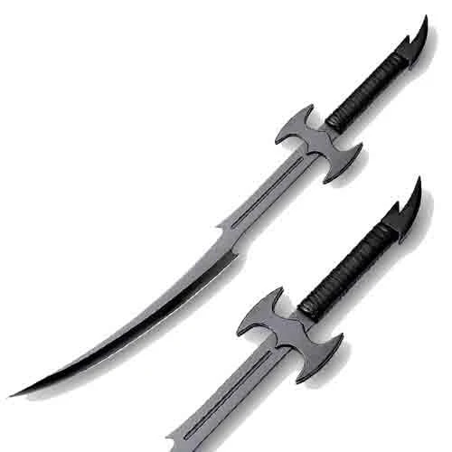 Fearsome, wicked, renegade and cold blooded. These are just a few of the words that came to mind when we first held this beast of a sword. The blade is a fantasy take on the classic scimitar, resulting in tiered edges and deadly points at the center and tip of the blade. The design is replicated at the end of the handle to provide a crushing point, and the oversized guard is sure to protect your hands. Includes a nylon sheath with zipper clasp and shoulder strap.