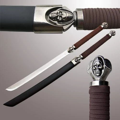 Blade: The blade of the sword is 440 stainless steel with a temper line along the edge of the blade. The blade of the sword is a saber style with a slight curve at the end of the blade and a taper at the base of the blade. Replacing the guard of the sword is a large blade collar cast in steel with a skull on each side. The sword comes already sharpened.Handle: The sword handle is steel, wrapped with imitation leather for grip. The sword ends with a large steel pommel decorated with a steel skull on each side. This pommel is a decoration as well as an offensive weapon for short range strikes as well as balancing the blade of the sword.scabbard Wood With Leather Reap Steel Clip.