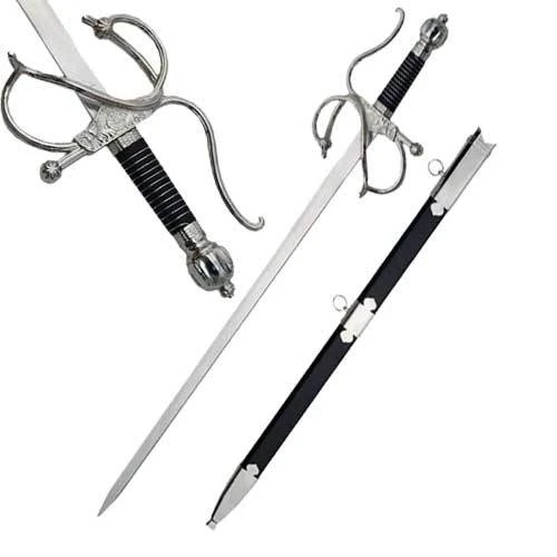 39″ Overall El Cod Rapier Sword 440 Stainless Steel with hard scabard. This classic replica was originally carried by the famed knight known as “The Cid”. Featuring a 29 1/2″ mirror polished stainless steel blade, a leather grip and custom sheath. 37 3/16″ov.