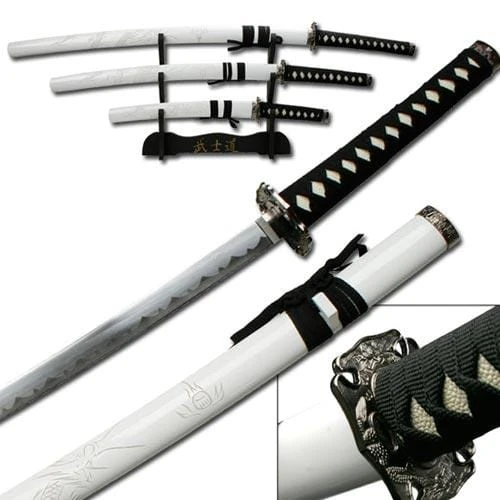 This Japanese Katana, Wakisashi, and Tanto sword set comes with the vivacious dragon and rising sun artwork etched into the wooden sides of each scabbard. The hardwood handles come with nylon cord wrapping and are accented by the decorative tsuba and pommel. The scabbards come with a clear coating for protection and matching nylon cord wrap.Katana: 36 1/2″ overall, 25 1/2″ blade. Wakisashi: 27 3/4″ overall, 18″ blade. Tanto: 18 1/8″ overall, 10 1/2″ blade.