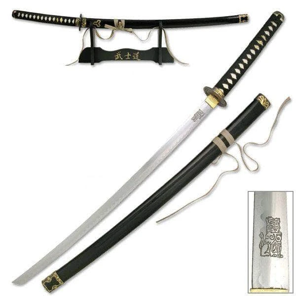 Sword Length – 41-1/2″ overall Features 12″ long handle and intricate samurai marking on scabbard. Has traditional and authentic long wrap technique on scabbard and two tone intricate metal trimmings throughout the sword. Symbol stamp on blade