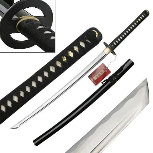 Solid iron tusba and fittings. Black laquered finished scabbard. Includes black cotton sword bag.