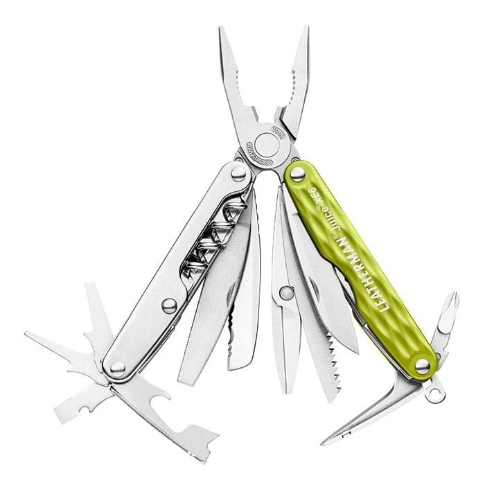 The bright XE6 has it all. Features pliers, wire cutters and four screwdrivers, saw, awl, diamond-coated file, straight and serrated blades, serrated scissors, corkscrew, can and bottle opener and lanyard attachment.