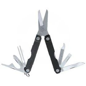 Ten useful tools are packed into this tiny, lightweight Leatherman. Scissors; Clip-Point Knife; Tweezers; Nail File / Cleaner; Flat Phillips Screwdriver; Extra Small Screwdriver; Medium Screwdriver; Bottle Opener; Ruler (Inch / Metric); Lanyard Attachment. Length: 2.5 inches. Weight: 1.75 ounces.