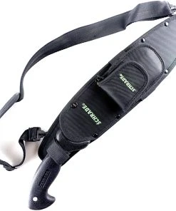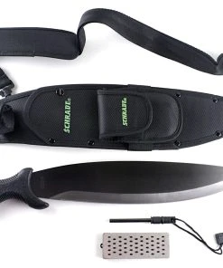 The Schrade Bolo Machete may just be the ultimate survival tool. Made from high carbon 3Cr13 titanium nitride-coated steel and featuring a unique rat-tail Safe-T grip tang, the Schrade Bolo offers uncompromising strength while minimizing overall weight, making for a large machete that is supremely easy-to-swing and carry. Its forward-weighted construction makes it the perfect tool for chopping and batoning wood, and it comes with a full arsenal of awesome accessories–a durable nylon case with removable straps, a fire-starter, and a sharpening stone.