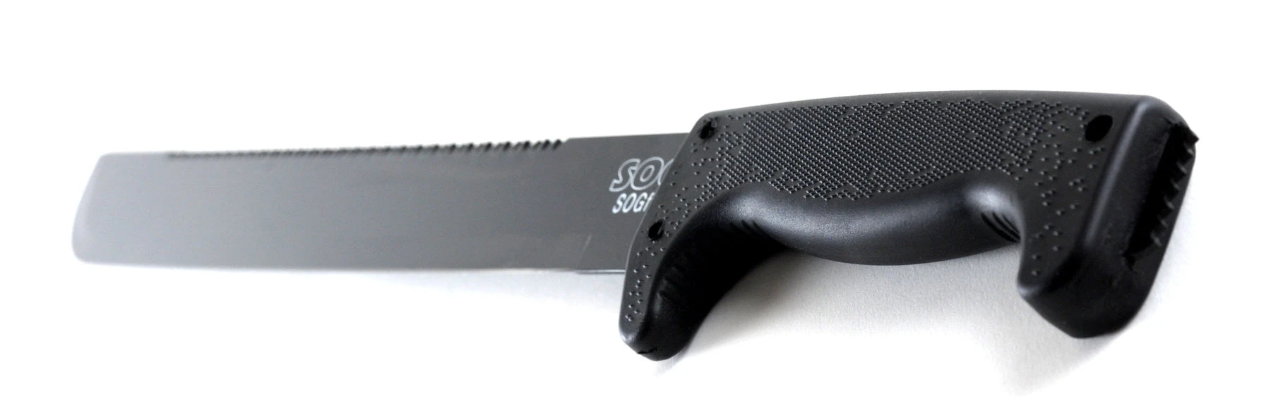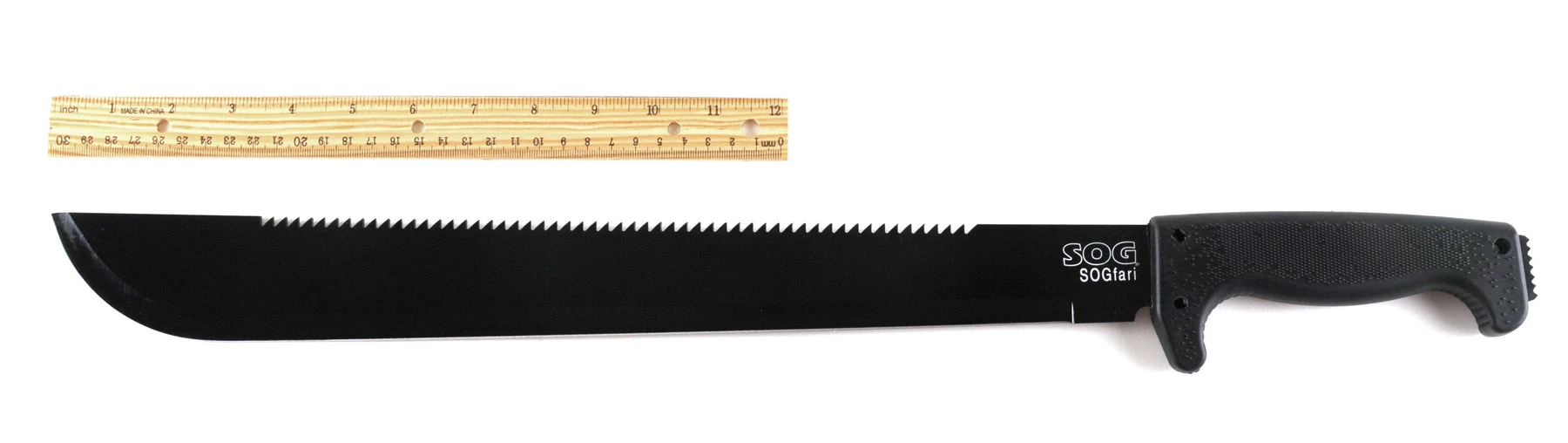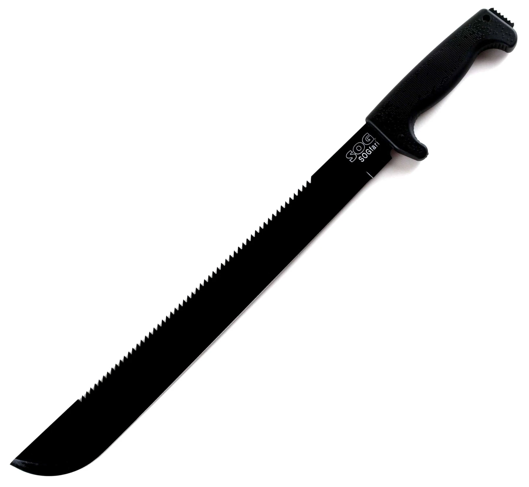 Bushwhack anything, anywhere, with this 18-inch machete from SOG. This heavy-duty wilderness machete can be used for blazing trails, chopping wood, hunting, preparing food, harvesting crops or even self-defense from wild animals. At only 15.7-ounces, this top-quality machete is easy to carry and swing; it also features a working saw on the back of the blades to ensure ultimate cutting performance and a high-quality sheath for convenience.