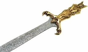 Collectible short sword featuring solid metal handle parts cast with intricate details and plated w/ 24k gold. The Damascus-etched blade is 420J stainless steel. Includes solid wood display plaque. Limited to 2400 pieces.