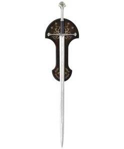 This is the reforged blade of Narsil, the sword wielded by Aragorn, King of Gondor. The inscription down the length of the blade on both sides is in the Tolkien language of Quenya, written in the runes of Eregion, that say: “Nányë Andúril i né Narsil i macil Elendilo. Lercuvanten i máli Mordórëo”. This translates to: “I am Andúril who was Narsil, the sword of Elendil. Let the thralls of Mordor flee me.” “The Sword of Elendil was forged anew by elvish smiths, and on its blade was traced a device of seven stars set between the crescent Moon and the rayed Sun, and about them were written many runes; for Aragorn son of Arathorn was going to war upon the marches of Mordor. Very bright was that sword when it was made whole again; the light of the sun shone readily in it, and the light of the moon shone cold, and its edge was hard and keen. And Aragorn gave it a new name and called it Andúril, Flame of the West.”