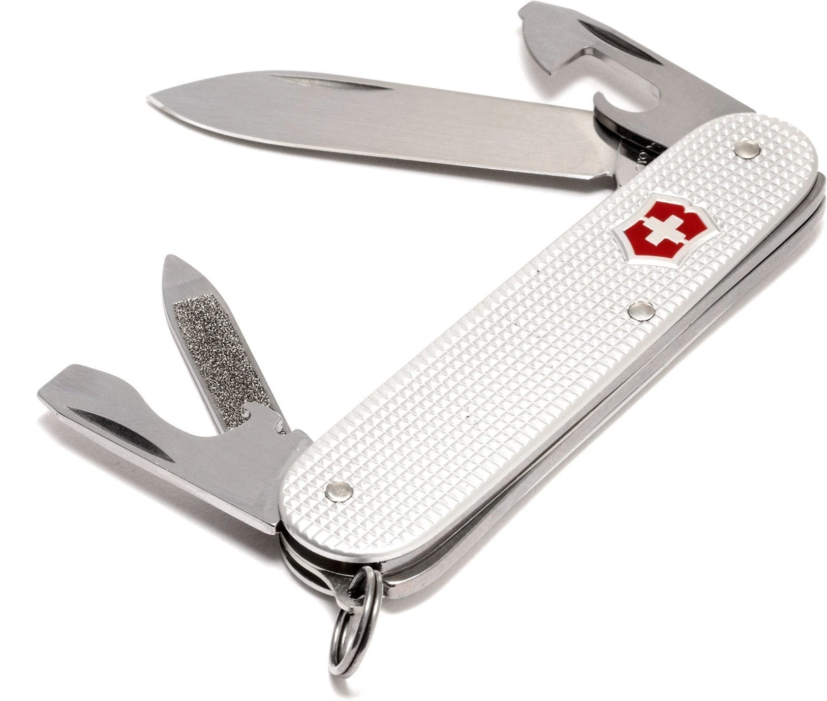 The Cadet features four main layer tools: large blade, bottle opener, nail file, and can opener. Within these tools are a nail cleaner, wire-stripper, and two screwdrivers.