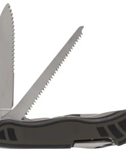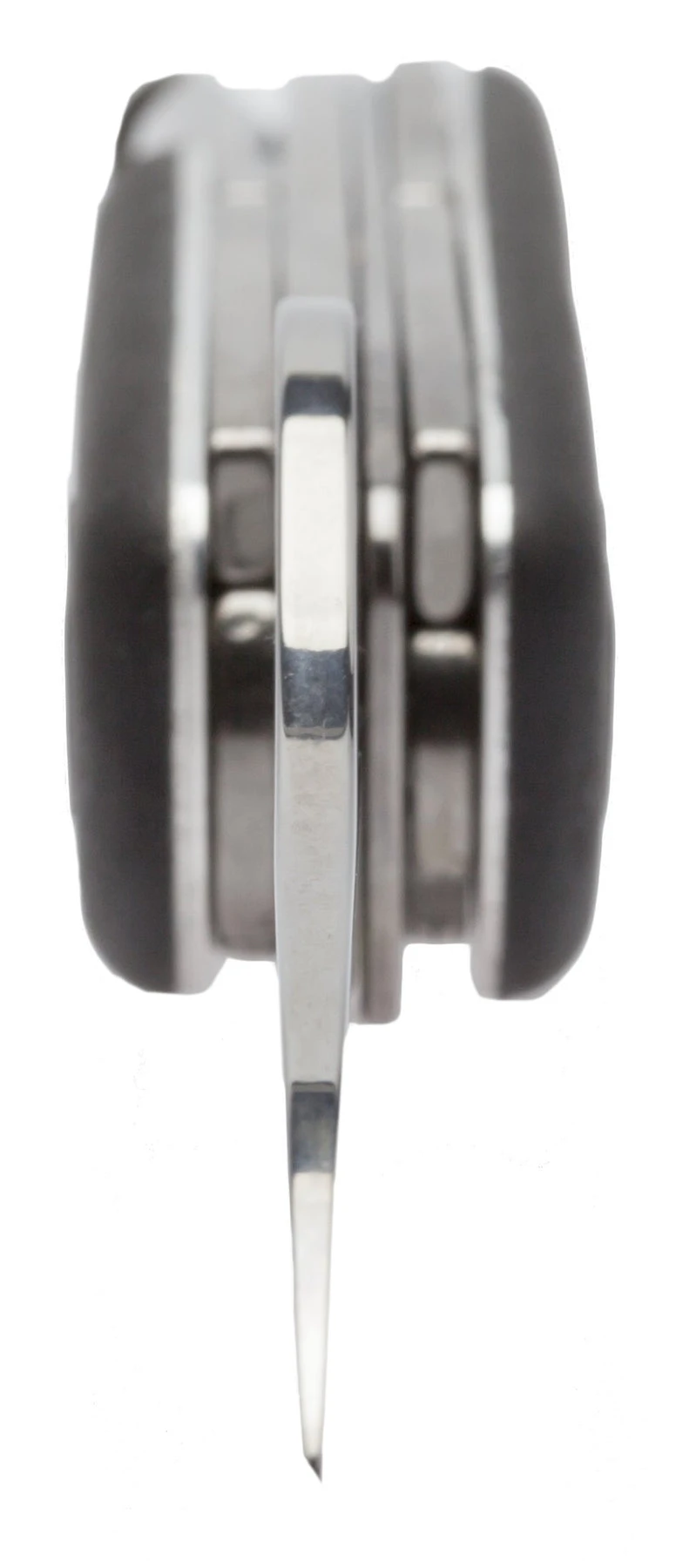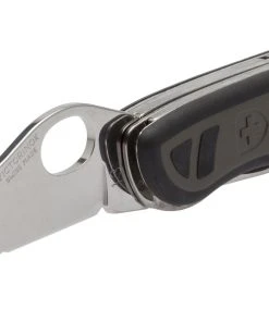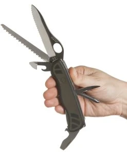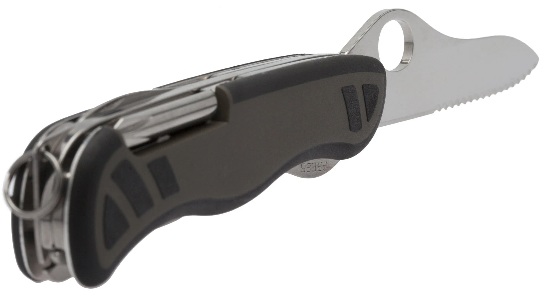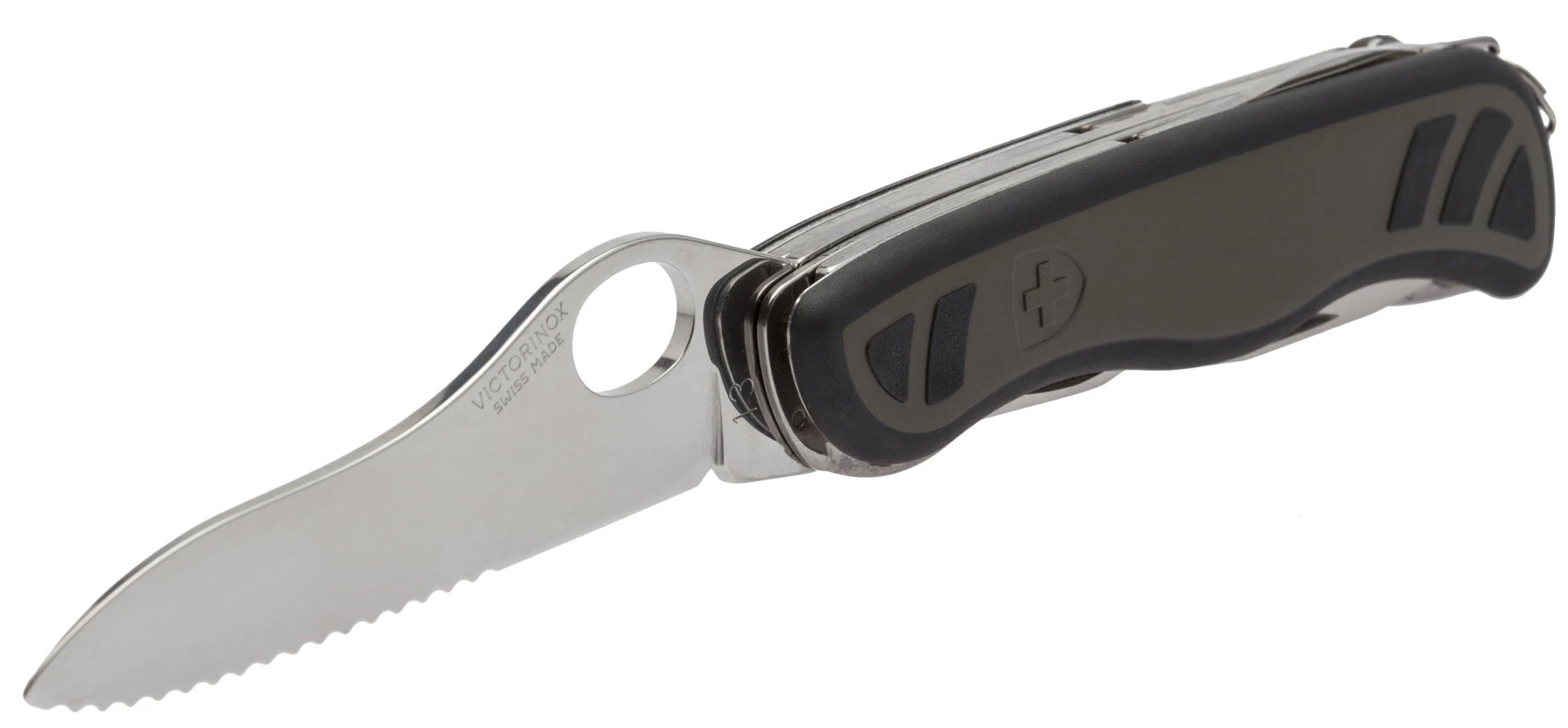 Unlike the previous iterations of the knife, the 2008 update features a partially serrated blade that locks into place via a liner lock. This gives the knife a versatility and strength other multitools don’t have. A thumb hole in the blade of the knife allows for single-handed opening with either hand.