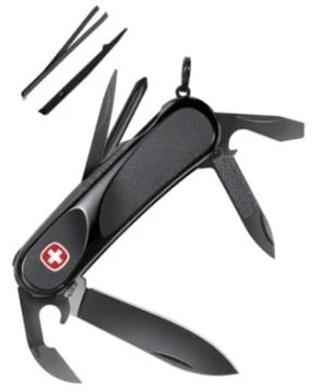 The Blackout Series incorporates the exceptional functionality and Swiss craftsmanship found in every Wenger Swiss Army Knife. Each model is encased in two black gloss EvoGrip handles with non-slip, flat-black rubber inserts. Open any tool and the black PVD coating quickly becomes the center of attention. The Physical Vapor Deposition (PVD) finish on every implement is non-reflective, durable, very hard and permanent. Chosen by some of the best watch makers in the world, as well as high-performance engine manufacturers, PVD is as attractive as it is resilient.